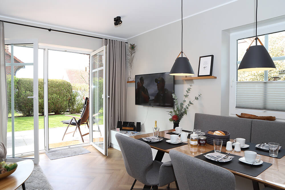 Wohn- und Esszimmer im Erdgeschoss, die moderne Küche indessen ist vollständig ausgestattet und integraler Bestand der gemeinsamen Räume. Von hier aus geht's nahtlos auf die Terrasse und in den sonnigen Garten – so verbringen alle ihre Urlaubszeit zwar miteinander und doch kann jeder seiner Lieblingssache nachgehen!