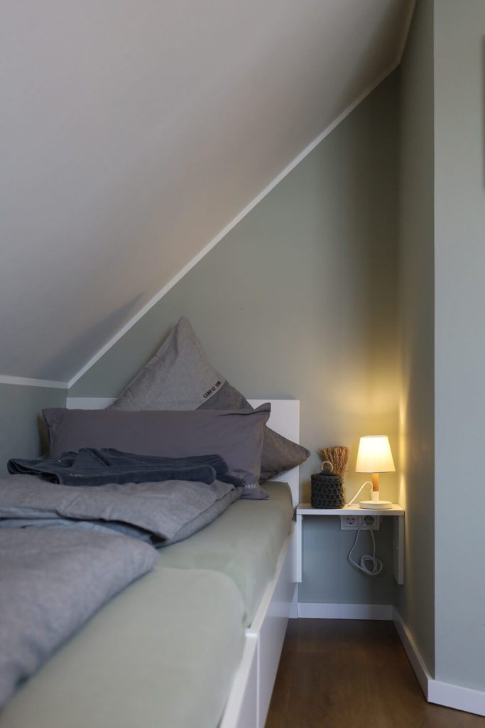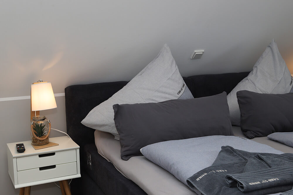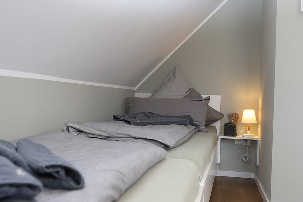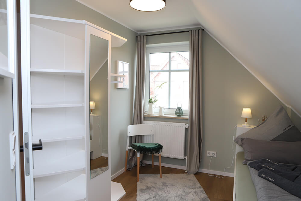 Im Obergeschoss des Hauses sind die beiden Schlafzimmer untergebracht. Im ersten Schlafzimmer befindet sich ein Boxspringbett für zwei Gäste (180 x 200 cm) und ein Kleiderschrank mit ausreichend Platz für Ihre Garderobe. Außerdem, nebst dem Fernseher im Wohnzimmer, ein weiterer Fernseher.