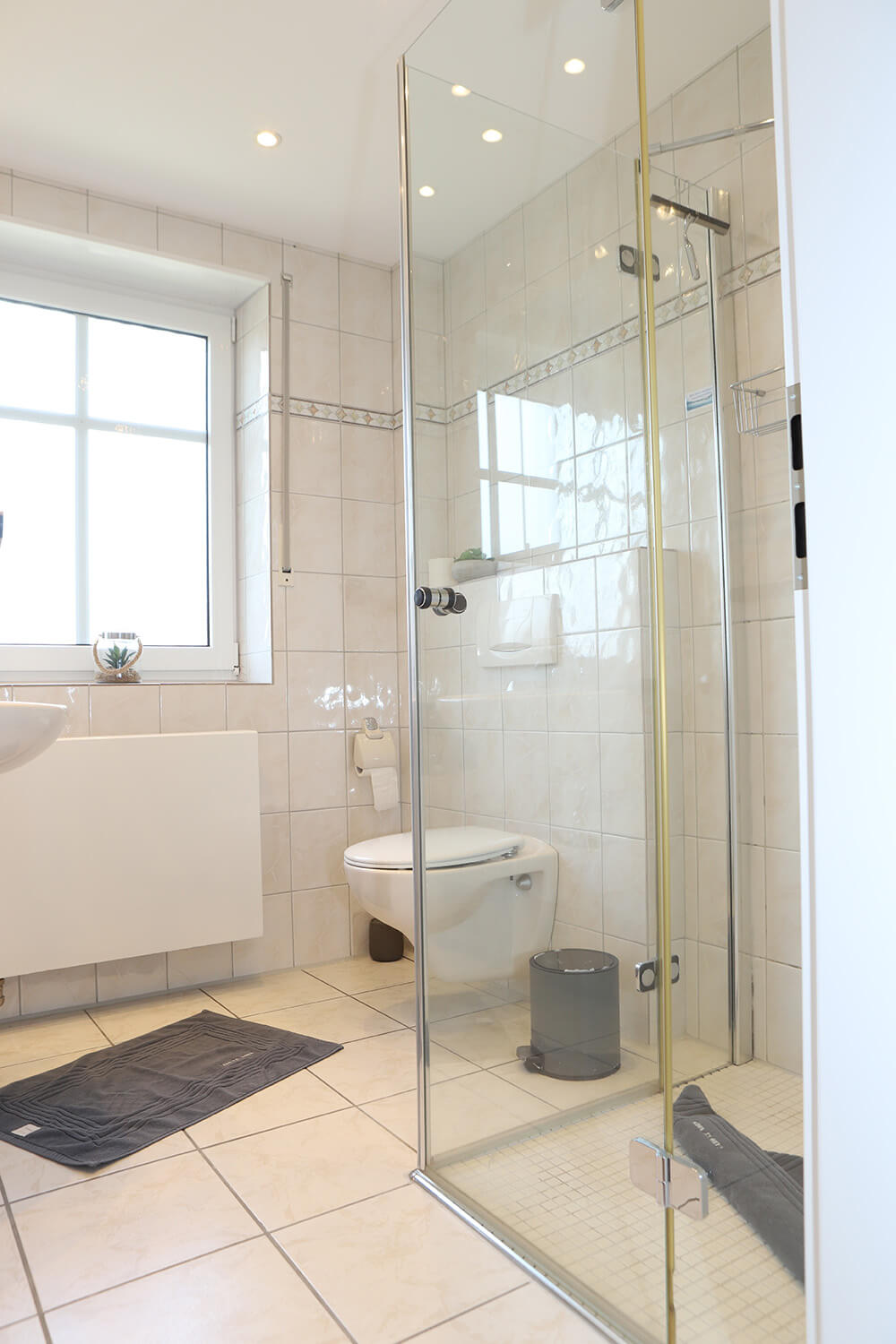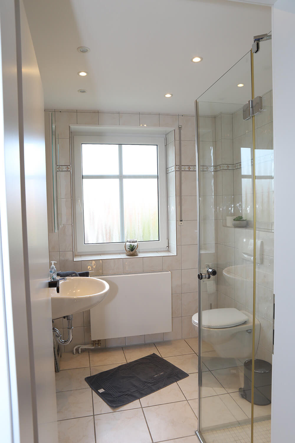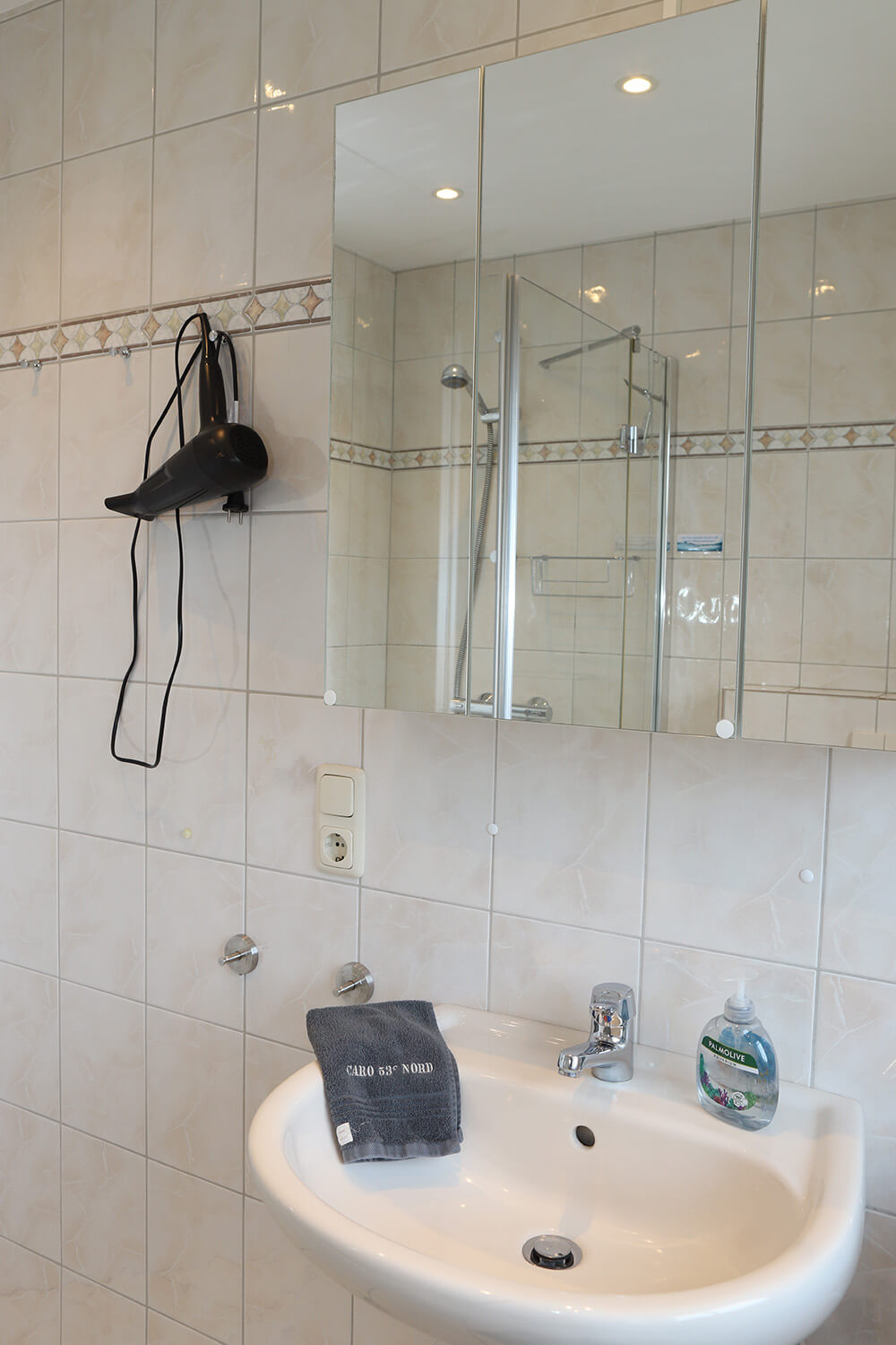 Ebenso befindet sich im Obergeschoss das Badezimmer mit Waschbecken, Spiegelschrank, WC und bodengleicher Dusche.